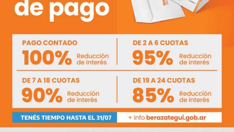 De esta manera, los beneficios en cada caso son: una reducción del 100% de intereses para quienes paguen al contado; del 95% para quienes abonen de dos a seis cuotas; del 90% para quienes paguen de siete a dieciocho cuotas; y del 85% si se abonan de diecinueve a veinticuatro cuotas.