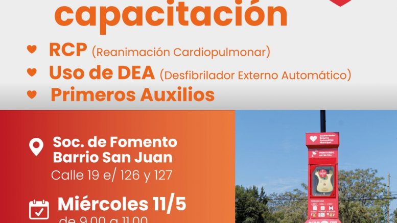 La Municipalidad de Berazategui informa que el miércoles 11 de mayo se llevará a cabo una jornada de salud en la que se capacitará en RCP (Reanimación Cardiopulmonar), uso del DEA (Desfibrilador Externo Automático) y primeros auxilios. La actividad se realizará en la Sociedad de Fomento San Juan (calle 19 e/ 126 y 127), de 9.00 a 11.00.