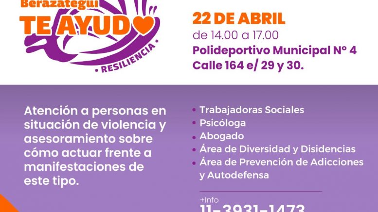 La Municipalidad de Berazategui informa que el viernes 22 de abril se realizará una jornada integral del Programa municipal Te Ayudo, en el Polideportivo Nº 4 del barrio Villa Mitre (calle 164 e/ 29 y 30), de 14.00 a 17.00.