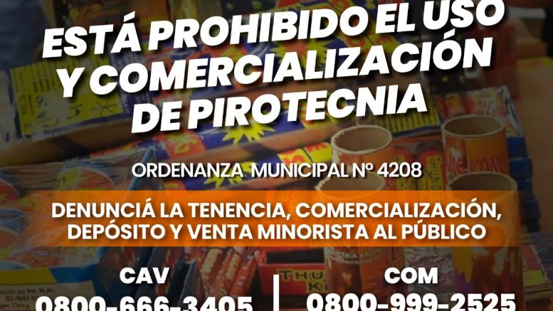 Mediante la Ordenanza Municipal Nº 4208, sancionada en 2008, está prohibido el uso y comercialización de pirotecnia en Berazategui. De esta manera, el Municipio solicita no comprar y denunciar los puestos y negocios que la comercializan, llamando al Centro de Atención al Vecino (CAV): 0800-666-3405, de lunes a viernes de 8.00 a 16.00 y sábados de 08.00 a 14.00, o al Centro de Operaciones Municipal (COM): 0800-999-2525/0247 todos los días durante las 24 horas.