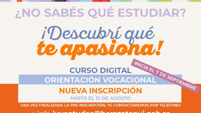 La Municipalidad de Berazategui, a través de la Subsecretaría de Juventudes, informa que el 7 de septiembre comenzará una segunda edición de los Cursos virtuales de Orientación Vocacional, propuesta que implementa hace 15 años y que desde 2020 -por la pandemia- se realiza vía online. Hay tiempo hasta el 31 de agosto para inscribirse en esta capacitación gratuita.