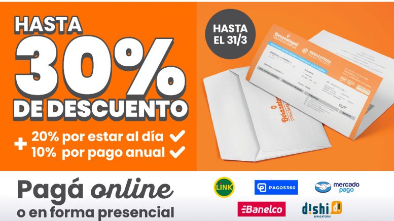 Se le informa a la comunidad de Berazategui que hasta el 31 de marzo de 2023 pueden abonar sus tasas de ABL (alumbrado, barrido y limpieza) y Servicios Sanitarios (agua y cloacas) con hasta un 30% de descuento. El objetivo de esta medida es beneficiar a todos aquellos vecinos y vecinas que estén al día (20%) y realicen su pago anual en forma adelantada (10%).