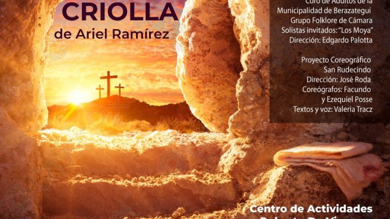 La Municipalidad de Berazategui presentará el domingo 24 de abril, a las 19.00, la Misa Criolla de Ariel Ramírez en el Centro de Actividades Roberto De Vicenzo (calle 18 y 148), con entrada libre y gratuita.