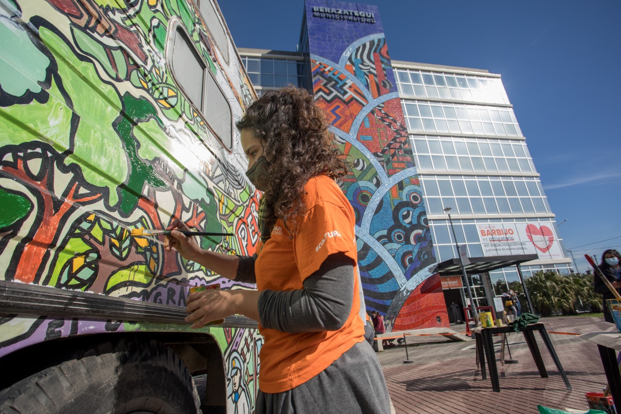 Integrantes de la Secretaría de Cultura y Educación, junto a beneficiarios del Programa Potenciar Trabajo, artistas locales y vecinos, están pintando el exterior del Centro Cultural Móvil con el mapa ilustrado de Berazategui –creado por el artista Juan Bertola–. Este vehículo recorre diferentes puntos del distrito, acercando propuestas interactivas, como juegos y talleres, para disfrutar en familia.
