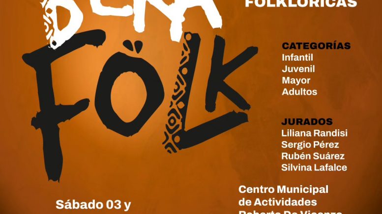 Llega la 1ra edición del Bera Folk, el primer certamen de Folclore de Berazategui. Se realizará el sábado 3 y domingo 4 de agosto, de 10.00 a 22.00, en el Centro Municipal de Actividades Roberto De Vicenzo (calle 18 y 148). Contará con la participación de bailarines y bailarinas del género, de todo el país. Las entradas se pueden adquirir en la puerta, los días del evento.