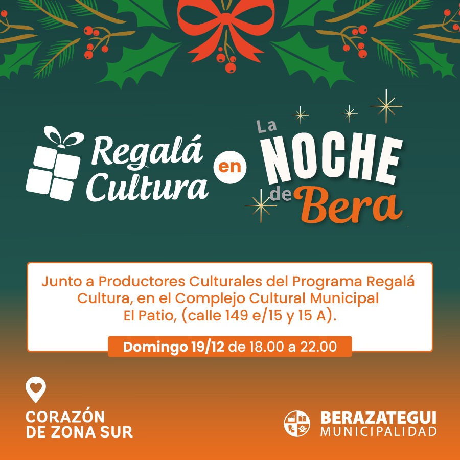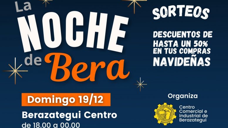 La Municipalidad de Berazategui informa que este domingo 19 de diciembre se realizará una nueva edición de “La Noche de Bera”, con descuentos de hasta un 50% en muchos rubros para las compras navideñas. Organizada por el Centro Comercial e Industrial local, la jornada se desarrollará en el Centro de Berazategui desde las 18.00 y hasta las 00.00. Asimismo, a cargo de la tienda “Regalá Cultura”, la Secretaría de Cultura y Educación municipal dispondrá sus producciones en el Complejo Cultural El Patio.