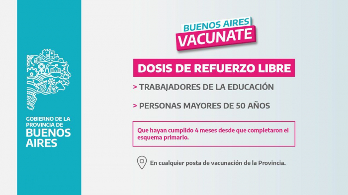 Frente al avance de la pandemia, el Gobierno de la provincia de Buenos Aires y la Municipalidad de Berazategui -a cargo del intendente Juan José Mussi- informan que los mayores de 50 años, y los trabajadores de la educación, ya pueden recibir su dosis de refuerzo contra el COVID-19 sin turno previo, en la posta sanitaria más cercana a su domicilio. Estos grupos poblacionales se suman a las personas gestantes o que se encuentren amamantando, inmunocomprometidos y personal de seguridad y de salud bonaerenses, que ya se pueden aplicar dicha vacuna sin cita previa.