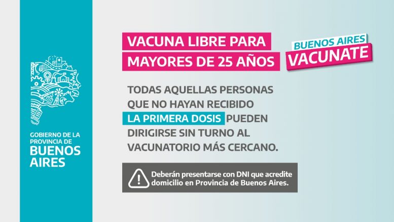 a partir del viernes 30 de julio esta medida se ampliará a todos los bonaerenses mayores de 18 años. De esta manera, los interesados deberán acercarse a las Postas de vacunación para recibir la primera dosis, con el único requisito de presentar el DNI que acredite domicilio en la provincia de Buenos Aires.